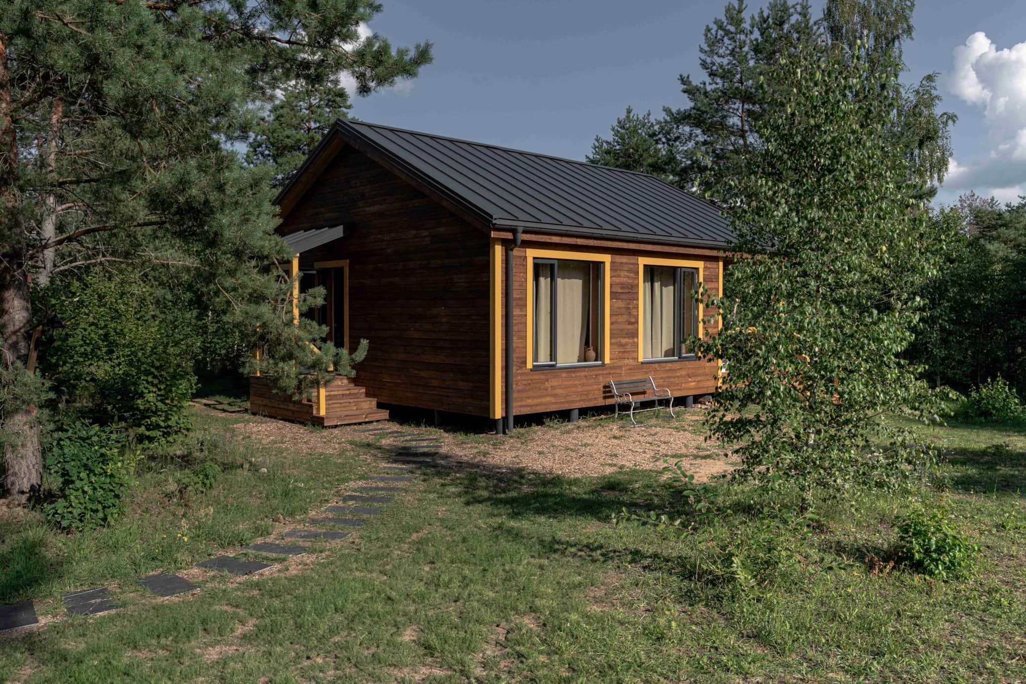 Geltonasis namelis - tai poilsio namelis laukiniuose Dzūkijos miškuose, kur susipina lietuviškas jaukumas ir skandinaviška dvasia. Čia modernūs elementai dera su autentiškomis antikvarinėmis detalėmis kurdami neįprastą, bet labai gražių vientisą paveikslą. Dideli mediniai langai leidžia mėgautis įspūdingais miško peizažais ir sustiprina gamtos artumo pojūtį. Namelyje pamatysite daug jaukių detalių ir tikimės pajusite kiek meilės ir darbo šeimininkai įdėjo savo rankomis kurdami šį namelį. Čia jų rankomis natūraliu molio tinku padengtos sienos, sumeistrauti baldai ir net grindys išlietos!